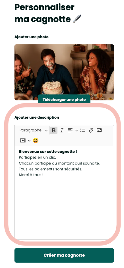 Personalisation is an important stage: it allows you to say more about yourself and your project - specifying how the funds will be used and telling your story - in order to reassure future contributors and make them want to support your money pot.