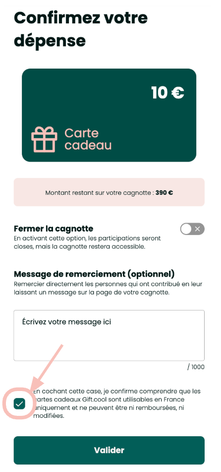 7️⃣ Sur la page de confirmation de dépense, cochez la case pour confirmer que vous avez pris connaissance des conditions d’utilisation et cliquez sur Valider ;