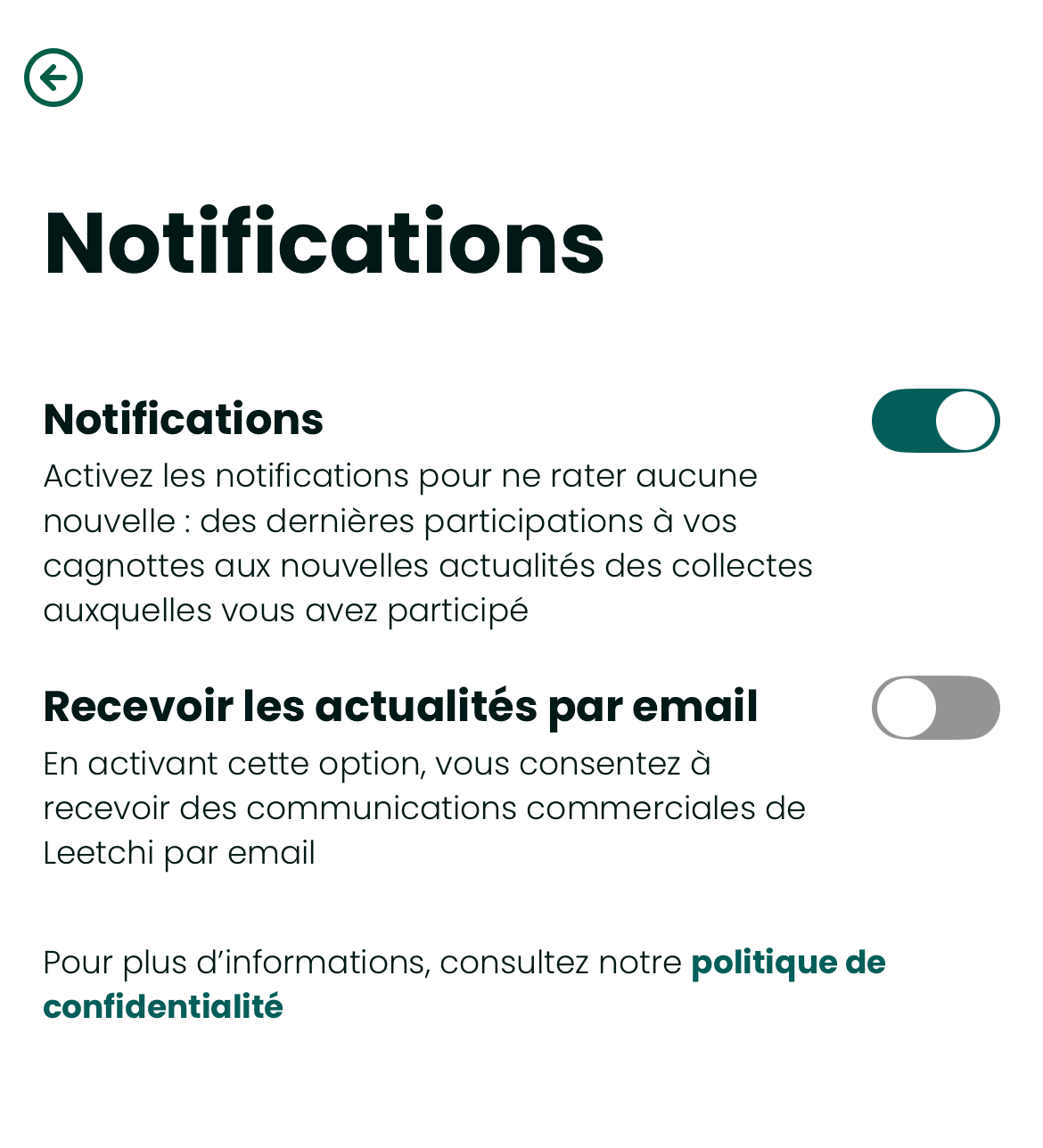 💡 Vous avez aussi la possibilité sur cette page d'activer ou désactiver la réception des actualités Leetchi.